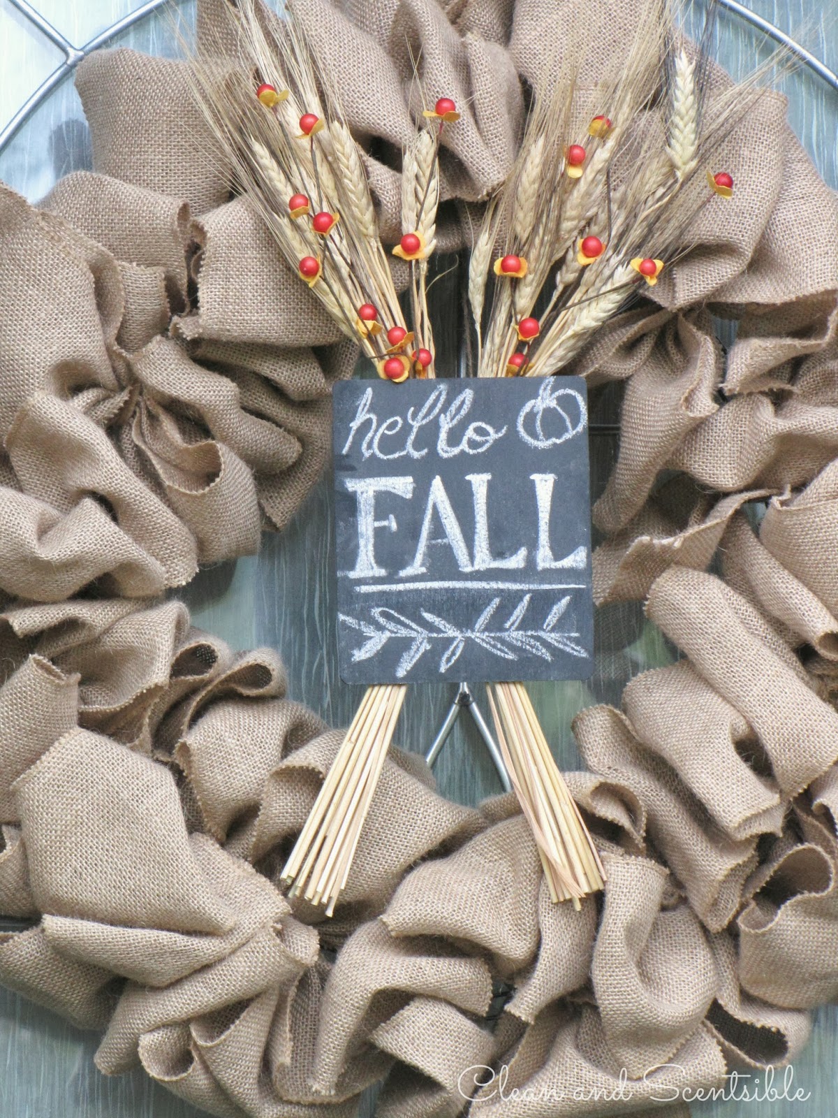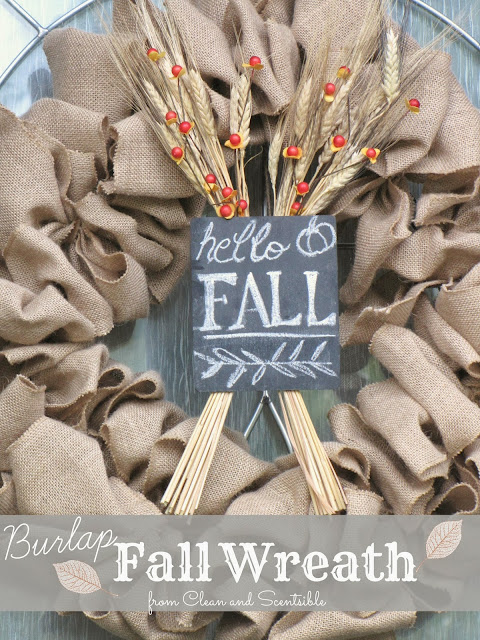 If you get a chance, pop on over to Clean and Scentsible to and see how the wreath looks on our front porch! I also have lots of other fall ideas like these ruffled felt pumpkins, harvest sign, and mini-raspeberry apple pies!