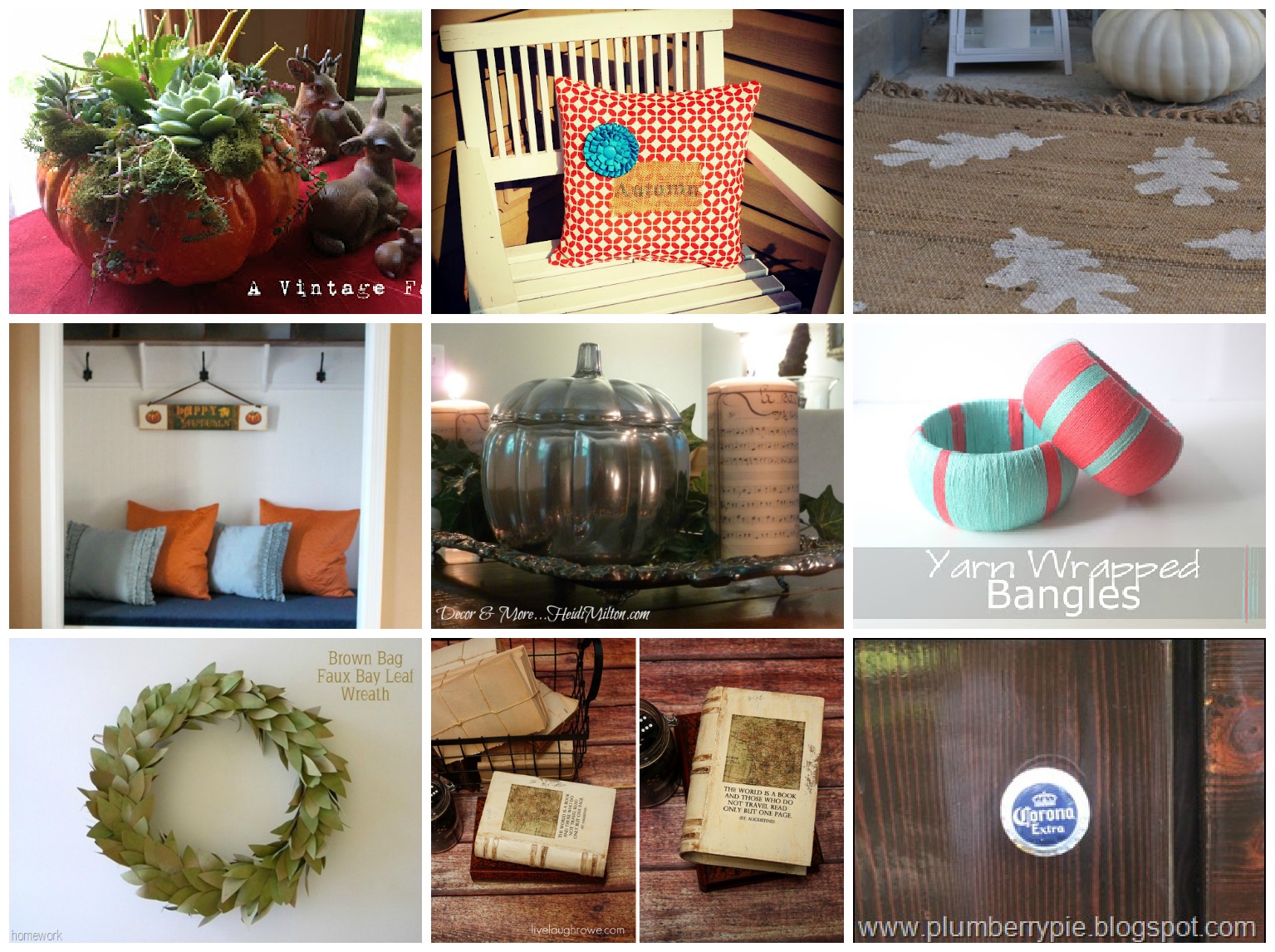2) Pumpkin planter by A Vintage Fairy 3) How to print on burlap by Delightfully Noted 4) Fall door mat by Life is a party 5) Entry Closet by A Sunday afternoon 6) Mirrored pumpkin by Decor and more 7) Yarn wrapped bangles by Eat Sleep Make 8) Brow Bag bay leaves by Homework 9) Vintage paper mache book by Live laugh Rowe 10) Bottle caps knobs by Plumberry Pie